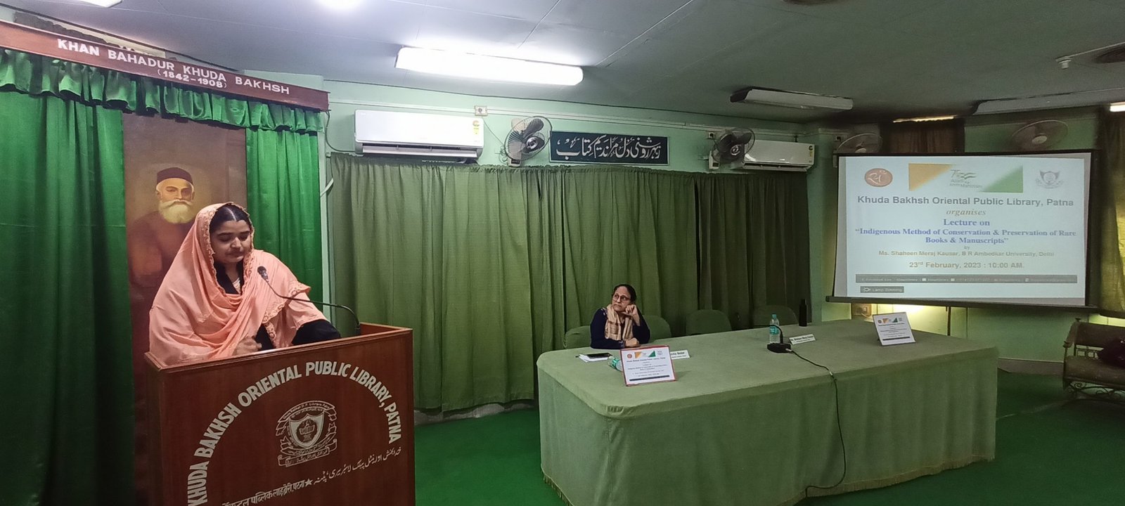 پٹنہ: ۲۳؍فروری۲۰۲۳ء : لائبریری کا بنیادی کام علم کی نشر و اشاعت ہے اور اس کے لئے ورکشاب، سمپوزیم، سیمنار، مذاکرہ اور لکچر جیسے مختلف ذرائع استعمال کئے جاتے ہیں۔ علم کی اشاعت کے ساتھ اس کا تحفظ بھی ضروری امور میں شامل ہے۔ لائبریری کا ایک اہم حصہ نادر اور نایاب کتابوں کا ہوتا ہے اور ان کتابوں کا تحفظ سب سے اہم ہوتا ہے۔ اسی مناسبت سے اس لکچر کا انعقاد کیا گیا ہے تاکہ جدید تکنیک کے علاوہ دیسی طریقۂ تحفظ سے بھی ہم واقف ہو سکیں۔ خدا بخش لائبریری میں بڑی تعداد میں نادر مخطوطات اور نایاب کتابیں موجود ہیں جن میں تاریخ خاندان تیموریہ، دیوان حافظ، کتاب التصریف اور کتاب الحشائش قومی اہمیت کے حامل مخطوطات ہیں۔ اسی تناظر میں محترمہ شاہین معراج کوثر ، ریسرچ اسکالر، بی آر امبیدکر یونیورسٹی، دہلی کو اس اہم موضوع پر لکچر دینے کے لئے مدعو کیا گیا تاکہ ان کے افکار و خیالات کی روشنی میں دیسی طریقے سے نایاب اور نادر کتابوں اور مخطوطات کے تحفظ کا ہنر جان سکیں۔ مذکورہ باتیں ڈاکٹر شائستہ بیدار، ڈائرکٹر خدا بخش لائبریری نے اپنی افتتاحی تقریر میں کہیں۔