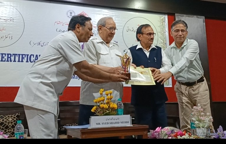 نئی دہلی5 مئی ۔غالب انسٹی ٹیوٹ نئی دہلی کے زیر اہتمام ایوان غالب میں ایک پروقار تقریب میں غالب انسٹی ٹیوٹ کی جناب سے چلائی جا رہی اردو اور فارسی کی آ ن لائن کلاسیز کے طلبا ء کوتقریب کے مہمان ذی وقار جناب سید شاہد مہدی صاحب سابق وائس چانسلر جامعہ ملیہ اسلامیہ نئی دہلی کے دست مبارک سے تقسیم اسناد پیش کی گئیں، اس موقع پر ڈاکٹر ادریس احمد صاحب ، ڈائریکٹر غالب انسٹی ٹیوٹ کی کاوشوں سے یہ آن لائن کلاسیز شروع کی گئی تھیں۔ وہ بھی بنفس نفیس تقریب میں موجود تھے اس کے علاوہ بہت سی معروف شخصیات جن میں اردو فارسی کلاس کے استاد محترم جناب طاہر الحسن صاحب محترم وپن گرگ صاحب (بیوروکیرٹ)محترم مشتاق احمد صاحب و دیگر معزز شخصیات موجود تھیں۔ اس موقع پر اردو فارسی میں جن طلبا نے نمایاں پوزیشن حاصل کیں ان کی مزید عزت افزائی کی گئیں۔ فارسی میں اول پوزیشن لانے والے شوکت اللہ خاں شیروانی (دہلی ( دوم پوزیشن لانے والے جگدیش پرشاد) پنجاب ( سوم پوزیشن لانے والی شاہ جہاں بی قابل ذکر ہیں۔