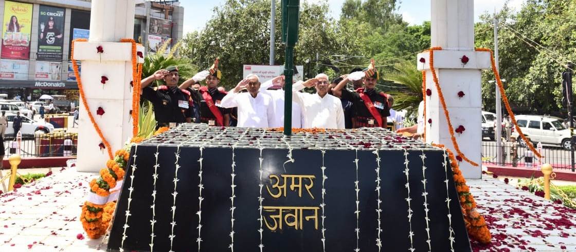 پٹنہ، 26 جولائی، 2023:- ’کارگل وجئے دیوس‘ کے موقعہ پر آج گاندھی میدان کے نزدیک منعقد سرکاری تقریب میں گورنر جناب راجندر وشوناتھ آرلیکر، وزیر اعلیٰ جناب نتیش کمار اور نائب وزیر اعلیٰ جناب تیجسوی پرساد یادو نے شہید کارگل یادگار مقام پر کارگل کے شہیدوں کو گلہائے عقیدت پیش کر کے خراج عقیدت پیش کیا۔