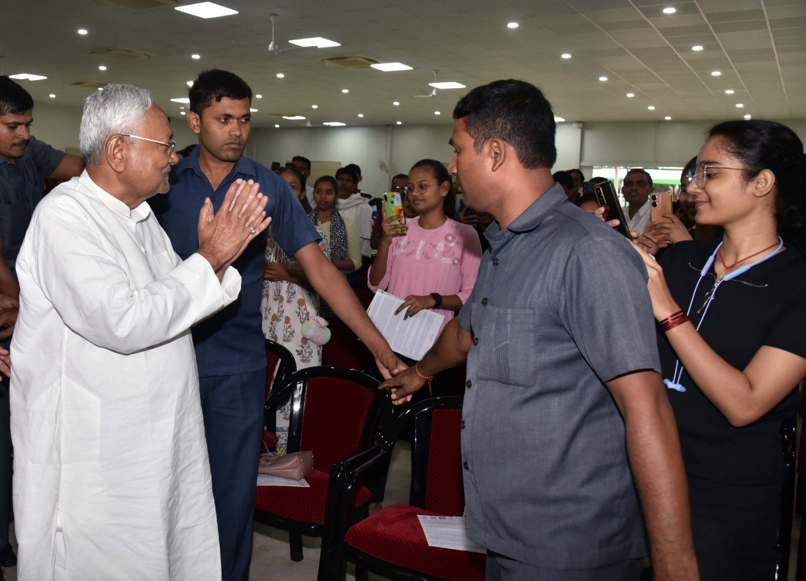 मुख्यमंत्री श्री नीतीश कुमार लगभग आधे घंटे प्रदेश मुख्यालय में रहे। इस दौरान अपने कक्ष में उन्होंने उपस्थित नेताओं के साथ सांगठनिक विषयों पर चर्चा की और जरूरी निर्देश दिए। इसके बाद मुख्यालय के पिछले हिस्से में चल रहे निर्माण कार्य का जायजा लिया। उसी समय कर्पूरी सभागार में जदयू व्यावसायिक एवं उद्योग प्रकोष्ठ तथा जदयू शिक्षा प्रकोष्ठ के संयुक्त तत्वाधान में आयोजित कार्यक्रम में 300 से अधिक युवा पार्टी की सदस्यता ग्रहण कर रहे थे। माननीय मुख्यमंत्री सभागार भी गए और बड़ी संख्या में छात्र-छात्राओं को देख प्रसन्नता व्यक्त की और सभी के साथ तस्वीर भी खिंचवाई।