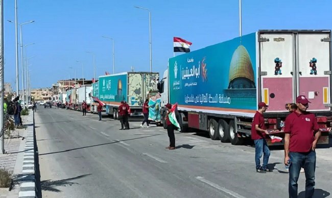 انسانی امداد لے جانے والے ٹرک رفح سرحدی گذرگاہ پر داخلے کے منتظر ہیں