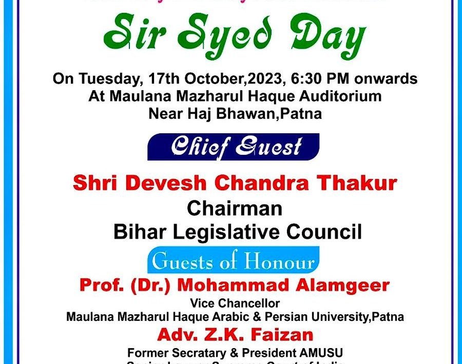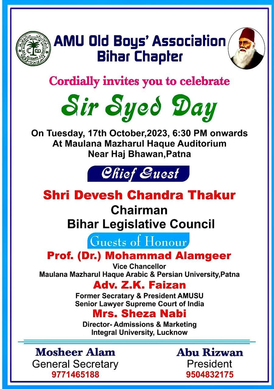 علیگڑھ مسلم یونیورسیٹی اولڈ بوائز ایسو سی ایشن بہار چیپٹر کے صدر جناب ابو رضوان اور سکریٹری جناب محمد مشیر عالم صاحب اور تنظیم کے تمام ایکزکیوٹیو ممبران اور سر سید ڈے مینیجمینٹ کمیٹی نے مشترکہ بیان دیا ہے کہ۔ ویژنری مصلح، مفکر، فلسفی اور علی گڑھ مسلم یونیورسٹی کے بانی سر سید احمد خان کو خراج عقیدت پیش کرنے کے لئے سر سید ڈے کا انعقاد کیا جا رہاہے۔ ۔ یہ تقریب [تاریخ] 17 October کو شام 6:30 بجے حج بھون کے قریب مولانا مظہر الحق آڈیٹوریم میں منعقد ہوگی اور اس تقریب میں تعلیمی اور ثقافتی رونقوں سے بھری ایک غیر معمولی شام ہونے کا وعدہ کیا گیا ہے۔