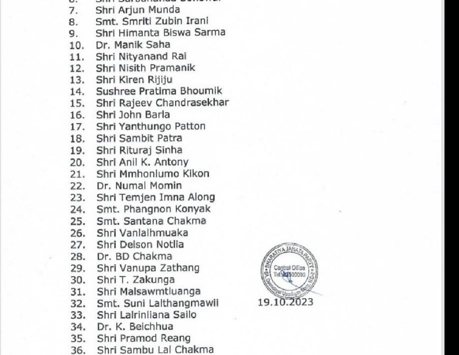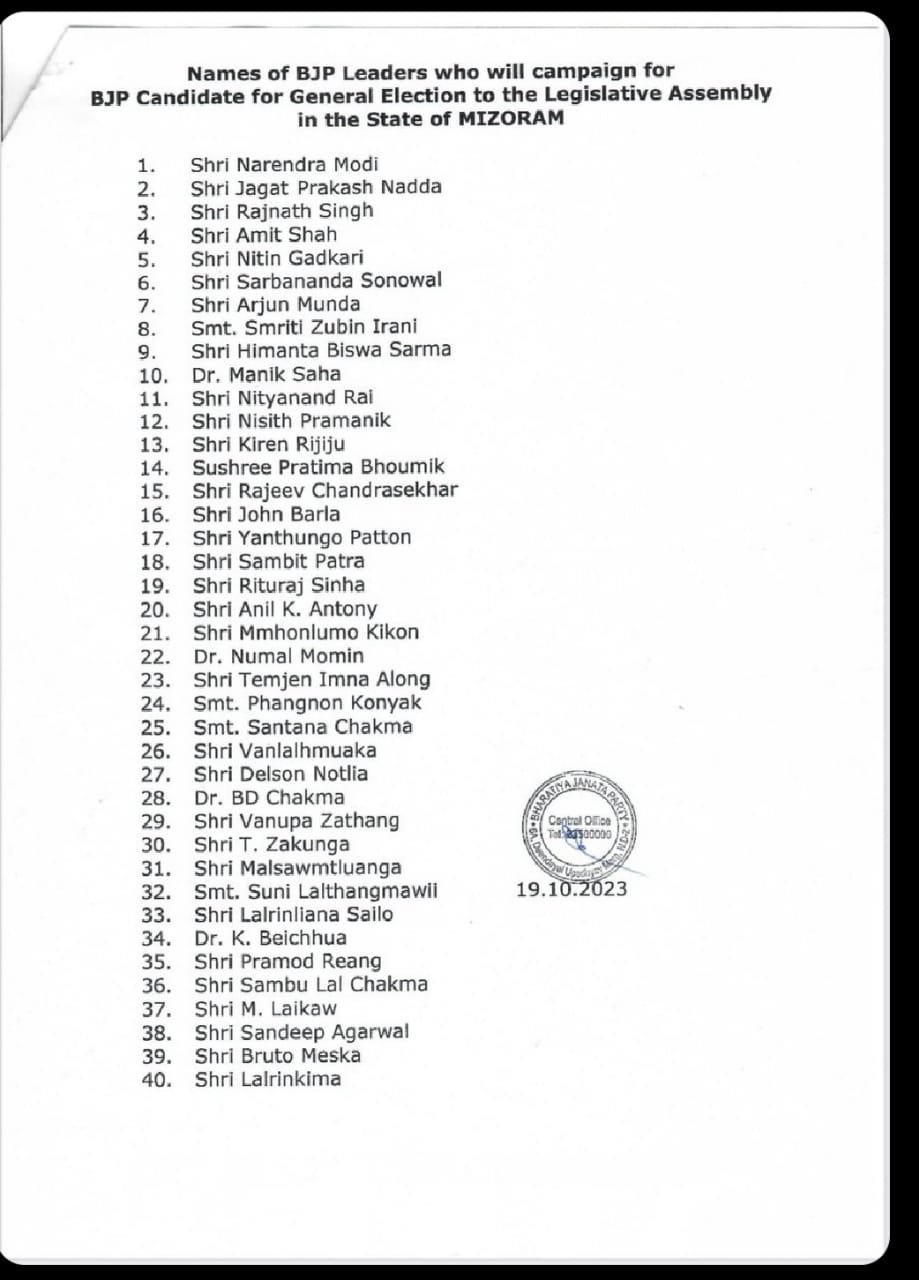 मिजोरम विधानसभा चुनाव के लिए भाजपा ने जारी की 40 स्टार प्रचारकों की सूची