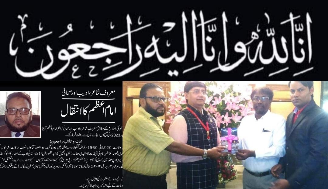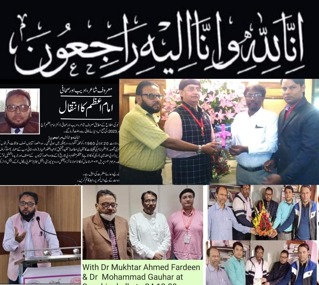 خصوصی رپورٹ/ کہہ گیے ڈاکٹر امام اعظم۔۔۔۔ میں نے سمجھا،اس نے سمجھا،بھیڑ میں بھی خاموشی تھی، کسے معلوم تھا کہ آج اردو دنیائے زبان وادب اور صحافت کا امام اعظم خود یہ کہہ جاءینگے اور اسطرح سے ڈاکٹر امام اعظم ہم سبھوں کو الوداع کہہ گیے اور اردو دنیاءے ادب و تعلیمی خدمات انجام دیتے دیتے ہمیشہ کے سو گیے داستاں کہتے کہتے۔۔۔۔۔۔۔۔۔ہماری ملاقات گرچہ ڈاکٹر محمد گوہر صاحب ایڈیٹر ان چیف تاثیر کے دورہ کلکتہ کے موقع پر تشریف لائے تو میں نے ڈاکٹر محمد گوہر صاحب کا استقبال کرتے ہوئے ہماری پہلی کتاب پی ایچ ڈی کرنے کے بعد پرورشِ لوح و قلم ڈاکٹر امام اعظم صاحب اور ڈاکٹر محمد گوہر، محمد شہاب الدین بھانجا نے ڈاکٹر امام اعظم صاحب کے اعتراف خدمات کے لئے آل انڈیا اردو ماس کمیونیکیشنل سوسائٹی فار پیس کی جانب سے انہیں اردو انمول رتن ایوارڈ سے بھی نوازے گئے، بہت پرسکون پروفیسر ڈاکٹر امام اعظم تھے وہ اپنے سادگی اور انکساری کا مثال رکھتے تھے اور ہر ایک شخص سے خندہ پیشانی سے پیش آتے تھے میں جب کبھی کلکتہ دورہ پر رہا ہواد کرتا تو امام اعظم صاحب سے ایک ملاقات ضرور ہوتا تھا، ڈاکٹر محمد گوہر کا ذکر کرتے تھے اور بلخصوص تاثیر اخبار کے لیے بھی ڈاکٹر امام اعظم صاحب اور ڈاکٹر مختار احمد فردین نے بہت زیادہ پروموٹ کرنے میں پیش پیش رہے اور آج ڈاکٹر امام اعظم صاحب اس سفر اردو زبان وادب اور تعلیم کی خدمات انجام دیتے ہوئے ہم سبھوں کو چھوڑ گیے، اللہ سبحانہ وتعالیٰ جنت الفردوس میں اعلی مقام عطا فرمائے آمین ڈاکٹر امام اعظم صاحب پر تفصیلات میں نے سوشیل میڈیا سے بشکریہ آپکی معلومات کے لئے اس تعزیتی پیام میں ریفرنس کے لئے اخذ کیا ہوں، بشکریہ