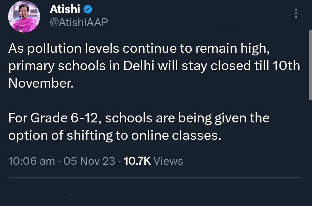 दिल्ली सरकार की शिक्षामंत्री आतिशी ने रविवार को इसकी जानकारी दी। उन्होंने एक्स पर कहा कि वायु प्रदूषण का स्तर लगातार बहुत खराब बना हुआ है। इसलिए दिल्ली में प्राथमिक स्कूल 10 नवंबर तक बंद रहेंगे। ग्रेड 6-12 के लिए स्कूलों को ऑनलाइन कक्षाओं में शिफ्ट होने का विकल्प दिया गया है।