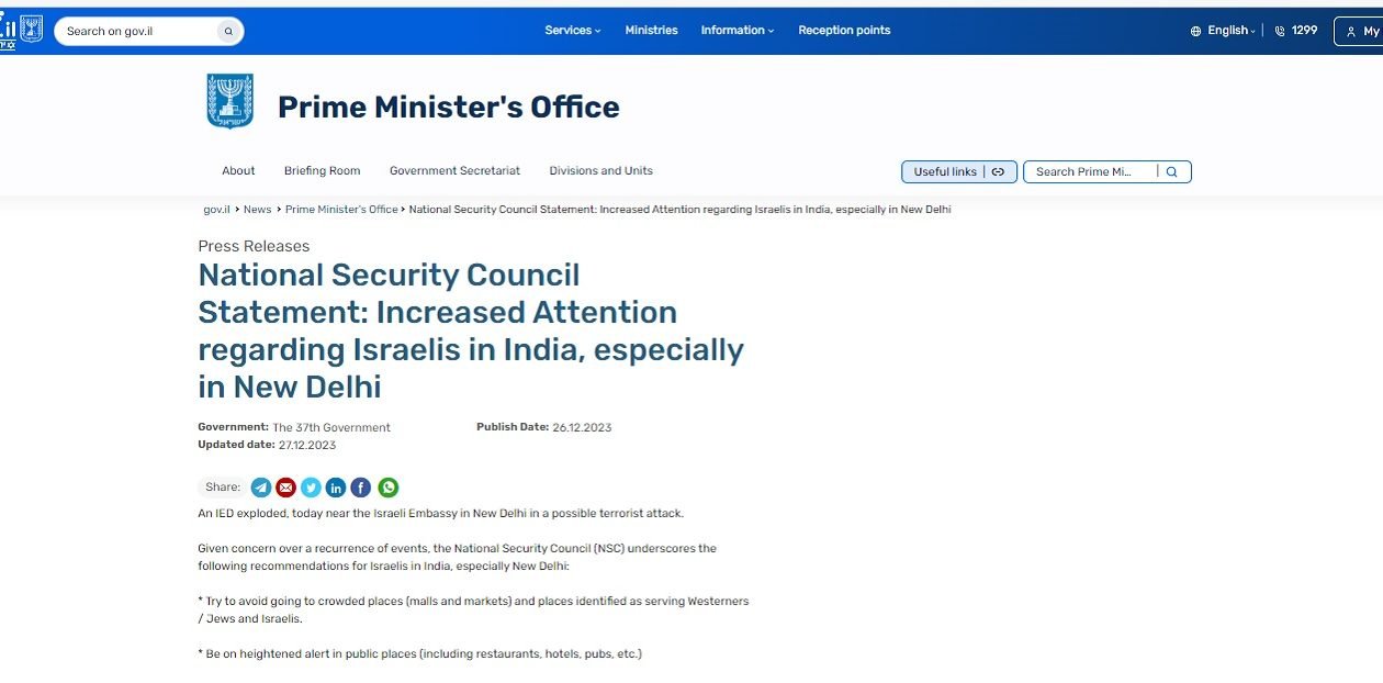 تل ابیب، 27 دسمبر:اسرائیل کی قومی سلامتی کونسل نے ہندوستان میں اپنے شہریوں کے لیے ٹریول ایڈوائزری جاری کی ہے۔ اس نے شبہ ظاہر کیا ہے کہ منگل کو نئی دہلی میں اسرائیلی سفارت خانے کے قریب ہونے والا دھماکہ’دہشت گردانہ حملہ ہو سکتا ہے۔’ یہ ایڈوائزری اسرائیل کے وزیر اعظم کی ویب سائٹ پر شیئر کی گئی ہے۔