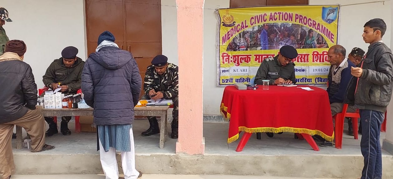 ارریہ :- ( مشتاق احمد صدیقی ) حکومت ہند کی سرپرستی اور 52 ویں بٹالین سشستر سیما بال کے کمانڈنٹ شری مہندر پرتاپ کی ہدایت پر سرحدی چوکی کواری کے تحت +2 گورنمنٹ ہائی اسکول کواری میں شہری فلاح و بہبود کے پروگرام کے تحت ایک مفت انسانی طبی کیمپ کا انعقاد کیا گیا۔ جس میں تقریباً 60 مریضوں کا مفت چیک اپ کرنے کے بعد 52 ویں بٹالین کے ڈاکٹر منوج جاٹ کی طرف سے مفت ادویات فراہم کی گئیں اور بتاتے چلیں کہ مریضوں میں خواتین، مرد اور بچے وبچیاں شامل تھے۔ اس سلسلے میں ڈاکٹر منوج جاٹ نے مقامی لوگوں کو کھانے پینے کی عادات، اپنی اور گھر والوں کی صفائی ستھرائی کے بارے میں اہم معلومات اور جانکاریاں دیں اور ساتھ ہی مقامی لوگوں کو بیٹی بچاؤ بیٹی پڑھاؤ کے بارے میں بھی آگاہ کیا۔ اس پروگرام کا بنیادی مقصد سرحدی علاقوں کے ان لوگوں کے لئے جو کسی نہ کسی وجہ سے علاج سے محروم رہ جاتے ہیں، کے لئے سشستر سیما بال کی جانب سے وقتاً فوقتاً لگائے جانے والے میڈیکل کیمپوں کے ذریعے لوگوں کو سہولیات فراہم کرنا ہے، ان سہولیات کے پیش نظر مقامی لوگوں میں کافی خوشی ومسرت دیکھی جارہی ہےاور سشستر سیما بال کے کام میں بڑھ چڑھ کر حصہ لے رہے ہیں۔ اس پروگرام میں انسپکٹر مونتولم چیتم، ٹیم انچارج کواری، کانسٹیبل ورون سنگھ، کانسٹیبل دلیپ کمار ترپاٹھی اور دیگر سپاہی اور ایس ایس بی کے جوان موجود تھے۔