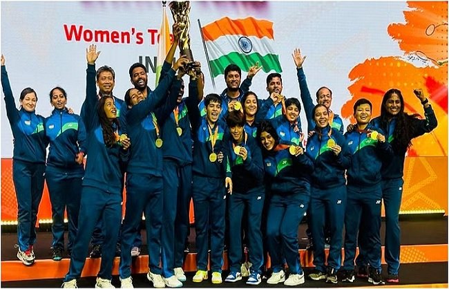 نئی دہلی ،18فروری :ہندوستان کی بیٹیوں نے تاریخ رقم کی ہے۔ ہندوستانی خواتین ٹیم نے بیڈمنٹن ایشیا ٹیم چمپئن شپ کا خطاب جیت لیا ہے۔ نوجوان انمول کھر ب نے ایک بار پھر شاندار کارکردگی کا مظاہرہ کرتے ہوئے ٹیم انڈیا کی جیت میں اہم کردار ادا کیا۔ ہندوستان نے ایک سنسنی خیز فائنل میں تھائی لینڈ کو 3-2 سے شکست دے کر اپنا پہلا طلائی تمغہ جیتا۔ پی وی سندھو کی قیادت میں ہندوستانی خواتین کی ٹیم کے نوجوان اور متحرک گروپ نے تھائی لینڈ کی امیدوں پر پانی پھیر دیا اور دو بار کانسی کا تمغہ جیتنے والی تھائی لینڈ کے خلاف کامیابی حاصل کی۔