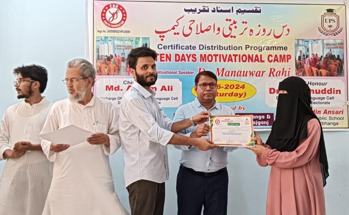 دربھنگہ(فضا امام)آج ہمارے سماج کے نئ نسل کو ایسے پروگرام اور ایسے لوگوں کی سخت ضرورت ہے ، ڈاکٹر منور راہی کی خدمات قابل ستائش ہیں ۔ یونائٹیڈ پبلک اسکول اور ایگزو یوتھ فاؤنڈیشن نے سماج کے لۓ بڑا کام کیا ہے ۔ یہ باتیں 15جون 2024 بروز سنیچر مہاراج گنج کے یونائٹیڈ پبلک اسکول اور ایگزو یوتھ فاؤنڈیشن کے اشتراک سے 5 تا 14 جون موٹیویشنل کیمپ کے اختتامی تقریب میں ڈی ڈبلو ایس جناب محمد اسلم علی نے مہمان خصوصی کی حیثیت سے کہی ۔اس تقریب میں ڈاکٹر جسیم الدین صاحب ،مترجم ضلع اردو سیل دربھنگہ کلکٹریٹ نے مہمان اعزازی کے طور پر شریک ہوۓ ۔ ڈاکٹر جسیم الدین صاحب نے ڈاکٹر منور راہی کے اس کام کو سراہتے ہوۓ کہا کہ ایک منور زماں حیدر آباد میں ہیں۔ ہمیں فخر ہے کہ دوسرا منور دربھنگہ میں ہے۔ ڈاکٹر جسیم الدین صاحب نے ظفر الدین انصاری اور ایگزو یوتھ فاؤنڈیشن کے شاداب عالم اور ان کی ٹیم کو منور راہی کے قدم سے قدم ملا کر چلنے اور اس پروگرام کے انعقاد کے لۓ مبارکباد پیش کی ۔پروگرام کا آغاز قاری شمس تبریز صاحب کی تلاوت سے ہوا ۔ بعد اس کے اسکول کے فاؤنڈر ظفر الدین انصاری صاحب نے خطبہ استقبالیہ پیش کیا اور ایگزو یوتھ فاؤنڈیشن و یونائٹیڈ پبلک اسکول کی جانب سے میمنٹو دے کر اسلم علی اور ڈاکٹر جسیم الدین صاحب کا استقبال کیا گیا ۔ اس کیمپ میں علاقے کی لگ بھگ 35 طالبات نے حصہ لیا۔ منتشاء ممتاز ، ندرت سمیہ اور کلثوم غزالہ نے اپنے تاثرات پیش کر کے سامعین کو متحیر کر دیا ۔اس موقع سے انجینئر عظمت اللہ ابوسعید نے بھی طالبات اور ان کے گارجین کو مبارکباد دیتے ہوۓ کہا کہ ایسے کیمپ میں بچیوں کو بھیج کر آپ حضرات نے اپنی بیداری کا ثبوت دیا ہے۔ معروف عالم دین جناب مفتی آفتاب غازی نے طلبات سے مخاطب ہو کر کہا کہ آپ نے اس کیمپ میں جو کچھ سیکھا ہے اس کو اپنی زندگی میں شامل کریں اور دوسروں کی بھی اصلاح کو اپنی ذمہ داری سمجھیں ۔ یونائٹیڈ پبلک اسکول کے ڈائریکٹر انجینئر راشد فیضی نے اس کیمپ کی اہمیت پر روشنی ڈالتے ہوۓ کہا کہ اس طرح کے پروگرام سے بچوں میں خود اعتمادی پیدا ہوتی ہے۔