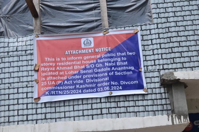 पुलिस ने कहा कि लोहार सेन्जी गडोले निवासी आतंकी सहयोगी रियाज अहमद भट के दो मंजिला आवासीय घर को कश्मीर के संभागीय आयुक्त के आदेश पर गैरकानूनी गतिविधि (रोकथाम) अधिनियम, 1967 की धारा 25 के प्रावधानों के तहत जब्त किया गया है। उन्होंने कहा कि यह घर एफआईआर संख्या 109/2023 से जुड़ा है, जो धारा 307 आईपीसी, 3/4 विस्फोटक पदार्थ अधिनियम और पुलिस स्टेशन कोकरनाग के यूए(पी) अधिनियम की धारा 16, 18, 20, 38 और 39 के तहत दर्ज है।