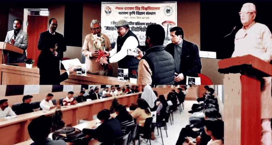 سہسرام ( انجم ایڈوکیٹ ) گوپال نارائن سنگھ یونیورسٹی کے تحت چلائے جانے والے نارائن کرشی وگیان سنستھان پلانٹ ڈیزیز شعبہ کے ذریعہ سات روزہ مشروم ٹریننگ پروگرام آج کامیابی کے ساتھ اختتام پذیر ہو گیا ۔ یونیورسٹی کے چانسلر مسٹر گوپال نارائن سنگھ نے پروگرام میں ٹریننگ مکمل کرنے والے کسانوں، طلباء اور دیگر لوگوں کو انٹرپرینیورشپ کی طرف قدم اٹھانے، انسٹی ٹیوٹ آف پلانٹ پیتھالوجی کے اساتذہ کو ایسی روزگار پر مبنی تربیت فراہم کرنے پر مبارکباد دی ۔ انسٹی ٹیوٹ کے ڈائریکٹر پروفیسر ایچ کے سنگھ نے سب کو خوش آمدید کہا اور ٹریننگ حاصل کرنے والے ٹرینی سے فیڈ بیک لیا اور انکی شرکت پر بھی مبارکباد دی ۔ اس موقع پر تمام ٹرینیز کو سرٹیفکیٹ بھی دئے گئے ۔ اس پروگرام میں انسٹی ٹیوٹ کے سینئر ترجمان پروفیسر اشوک کمار، پروفیسر ڈی آر سنگھ اور شعبہ پودہ امراض کے اسسٹنٹ پروفیسر ڈاکٹر پرشانت کمار سنگھ اور ڈاکٹر شیوم سنگھ اور دیگر اساتذہ موجود تھے ۔