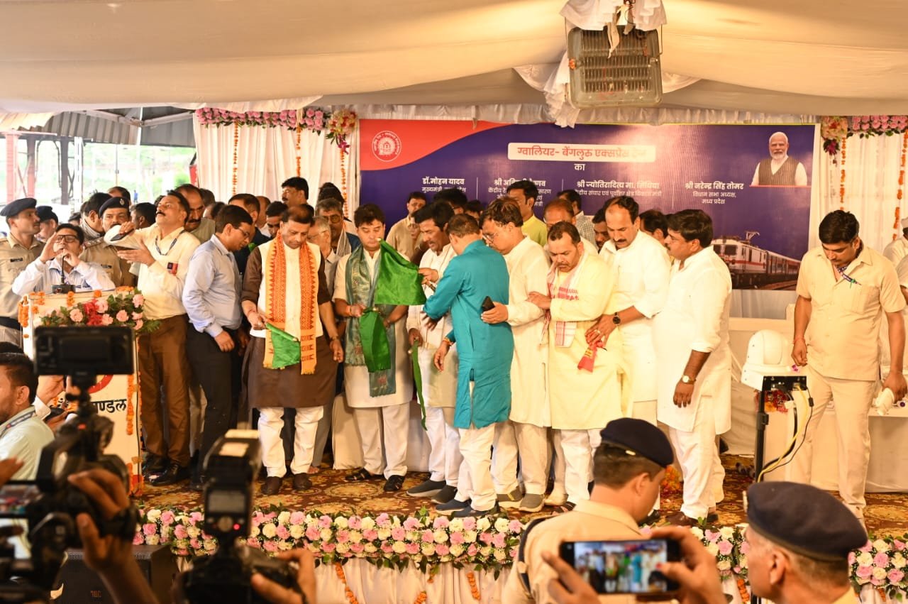 आज दिनांक 26.06.25 को डॉ मोहन यादव,मुख्यमंत्री, मध्य प्रदेश,केंद्रीय रेल, सूचना एवं प्रसारण, इलेक्ट्रॉनिक्स और सूचना प्रोद्योगिकी मंत्री अश्विनी वैष्णव तथा केंद्रीय संचार एवं पूर्वोत्तर क्षेत्र विकास मंत्री ज्योतिरादित्य मा. सिंधिया ,विधान सभा अध्यक्ष नरेंद्र सिंह तोमर, ऊर्जा मंत्री, मध्य प्रदेश श्री प्रद्युम्न सिंह तोमर तथा सांसद ग्वालियर श्री भारत सिंह कुशवाह एवं उपस्थित अन्य अतिथियों के साथ ग्वालियर – एसएमवीट. बेंगलुरू एक्सप्रेस हरी झंडी दिखाकर रवाना किया गया।