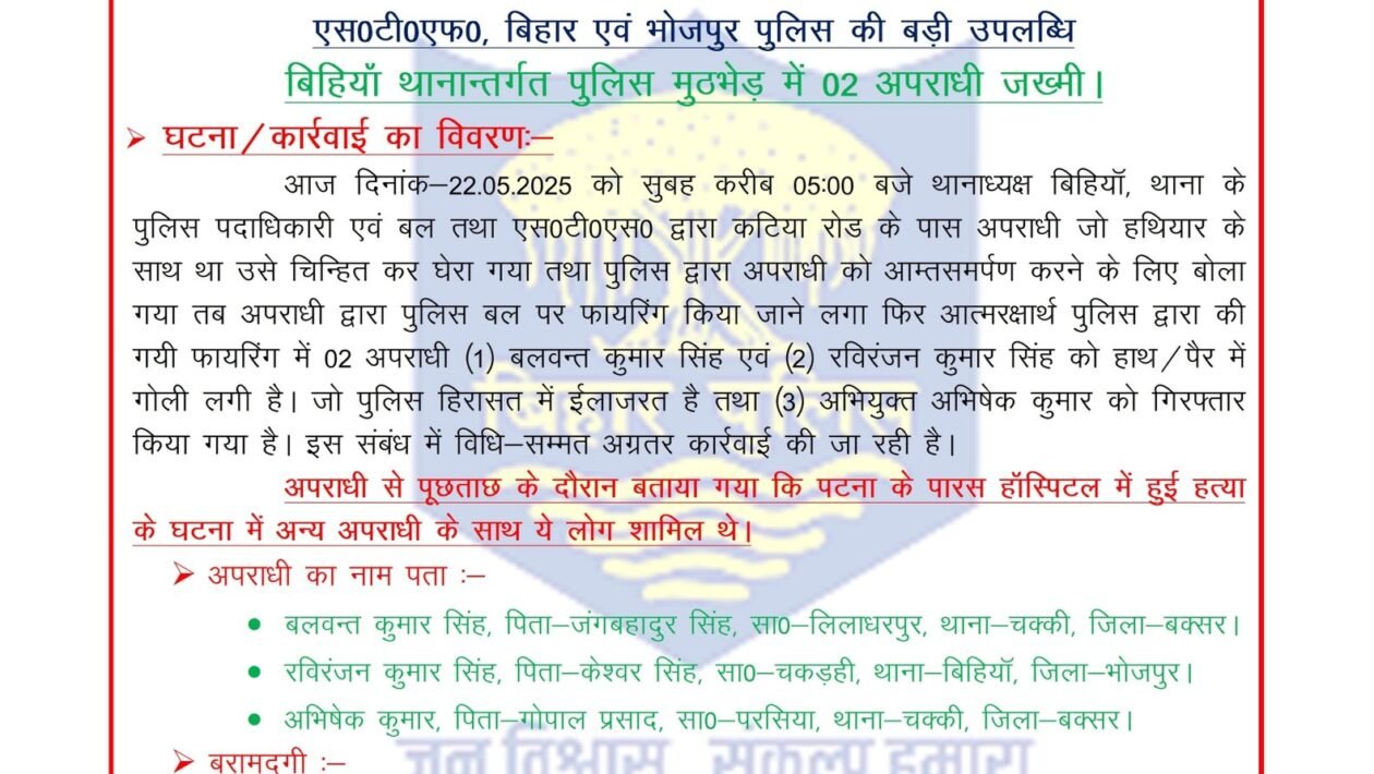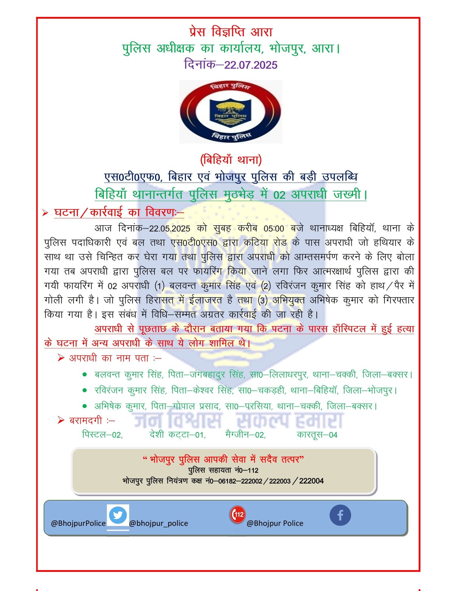 भोजपुर पुलिस की विज्ञप्ति के अनुसार, अपराधियों ने पुलिस को देखते ही ताबड़तोड़ फायरिंग शुरू कर दी। जवाबी कार्रवाई में पुलिस ने भी गोली चलाई, जिसमें दो अपराधी बलवन्त कुमार सिंह और रविरंजन सिंह को हाथ और पैर में गोली लगी है। एक अपराधी अभिषेक कुमार को गिरफ्तार किया गया है। पूछताछ में उन्होंने गुनाह कबूल कर लिया। घायल अपराधियों को आरा सदर अस्पताल में भर्ती कराया गया है।