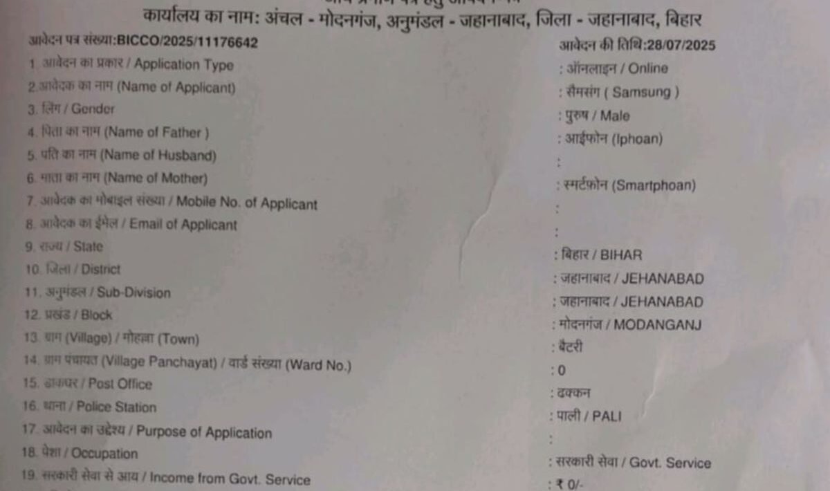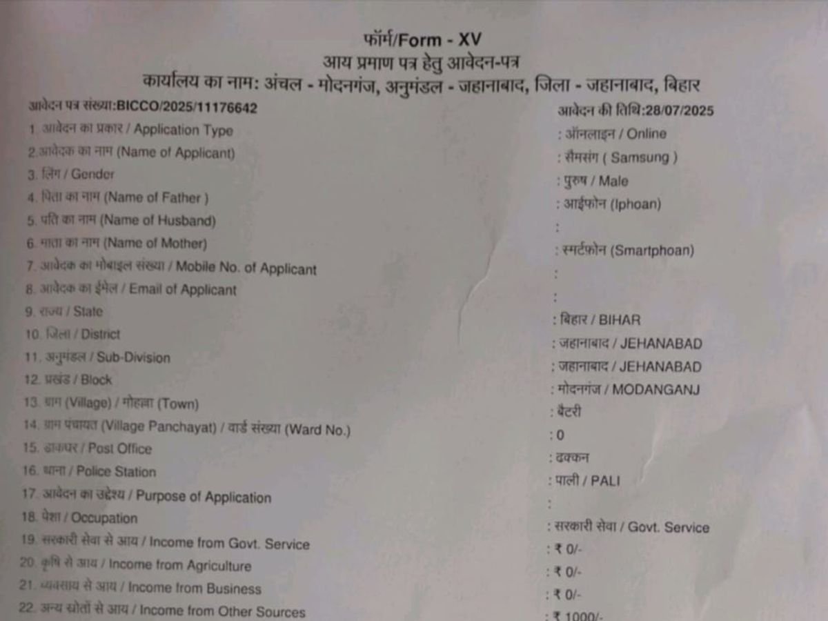 یہ معاملہ جہان آباد ضلع کے مودن گنج زون کا ہے، جہاں ایک درخواست دہندہ نے آن لائن انکم سرٹیفکیٹ کے لیے درخواست دی ہے۔ درخواست میں یہ فارم زون کے کارکنوں تک پہنچا تو وہ حیران رہ گئے اور فوری طور پر زون افسر محمد آصف حسین کو اس کی اطلاع دی۔ سی او محمد آصف حسین نے اسے حکومتی نظام کے ساتھ مذاق اور کام میں رکاوٹ قرار دیا۔