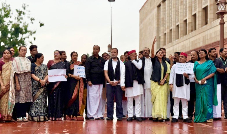 संसद के मानसून सत्र के तीसरे दिन बुधवार को कांग्रेस के पूर्व अध्यक्ष एवं लोकसभा में विपक्ष के नेता राहुल गांधी के नेतृत्व में इंडिया गठबंधन के नेताओं ने संसद भवन परिसर में प्रदर्शन किया। इसमें समाजवादी पार्टी के अध्यक्ष अखिलेश यादव सहित कई प्रमुख विपक्षी नेता शामिल हुए। कांग्रेस, समाजवादी पार्टी, राष्ट्रीय जनता दल (आरजेडी), द्रविड़ मुनेत्र कड़गम (द्रमुक) और अन्य विपक्षी दलों के नेताओं ने एकजुट होकर इस प्रक्रिया के खिलाफ आवाज बुलंद की।