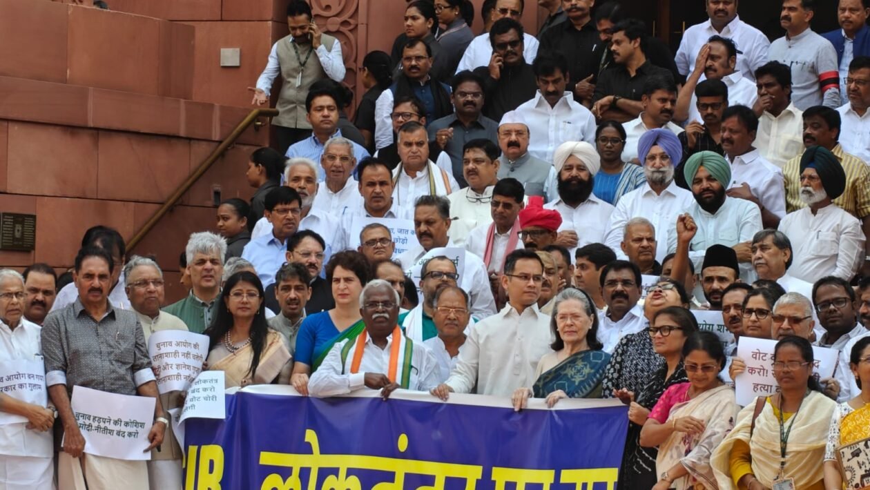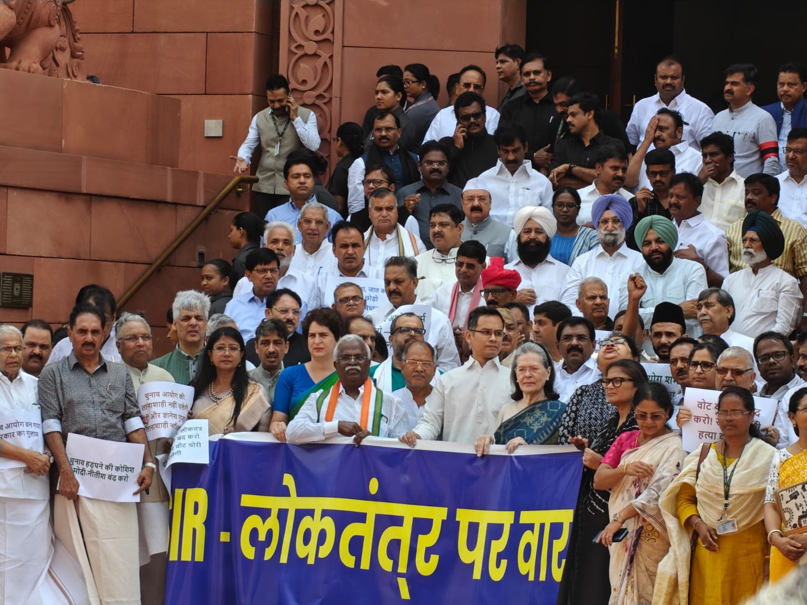 संसद के मानसून सत्र के चौथे दिन बिहार में जारी मतदाता सूची विशेष गहन पुनरीक्षण (एसआईआर) के विरोध में विपक्षी दलों ने संसद भवन परिसर में प्रदर्शन किया। इस प्रदर्शन में कांग्रेस संसदीय दल की अध्यक्ष सोनिया गांधी, प्रियंका गांधी सहित विपक्षी इंडी गठबंधन के सांसदों ने हिस्सा लिया। विपक्षी सांसदों ने नारेबाजी करते हुए एसआईआर प्रक्रिया को तत्काल वापस लेने की मांग की।