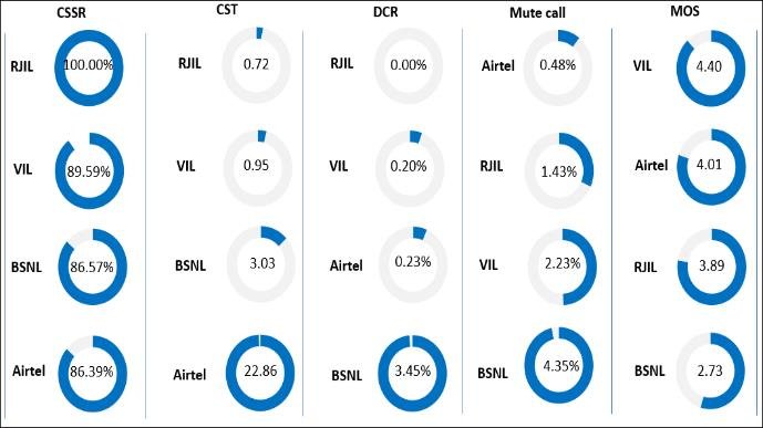 Call Setup Success Rate: Airtel, BSNL, RJIL and VIL have call setup success rate of 86.39%, 86.57%, 100.00% and 89.59% respectively in auto-selection mode (5G/4G/3G/2G). Call Setup Time: Airtel, BSNL, RJIL and VIL have call setup time of 22.86, 3.03, 0.72 & 0.95 seconds respectively in auto-selection mode (5G/4G/3G/2G). Drop Call Rate: Airtel, BSNL, RJIL and VIL have drop call rate of 0.23%, 3.45%, 0.0% & 0.20% respectively in auto-selection mode (5G/4G/3G/2G). Call Silence/Mute Rate: Airtel, BSNL, RJIL and VIL have silence call rate 0.48%, 4.35%, 1.43% & 2.23% respectively in packet switched network (5G/4G). Mean Opinion Score (MOS): Airtel, BSNL, RJIL and VIL have average MOS of 4.01, 2.73, 3.89 & 4.40 respectively. |