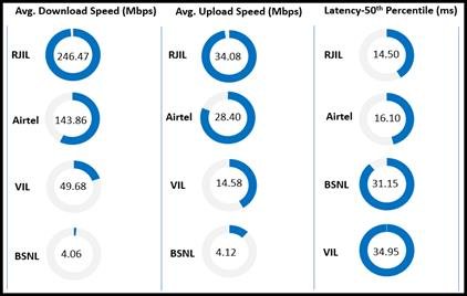Data Download performance (Overall): Average download speed of Airtel (5G/4G) is 143.86 Mbps, BSNL (4G/3G/2G) is 4.06 Mbps, RJIL (5G/4G) is 246.47 Mbps and VIL (4G) is 49.68 Mbps. Data Upload performance (Overall): Average upload speed of Airtel (5G/4G) is 28.40 Mbps, BSNL (4G/3G/2G) is 4.12 Mbps, RJIL (5G/4G) is 34.08 Mbps and VIL (4G) is 14.58 Mbps. Data performance – Hotspots (in Mbps): Airtel- 4G D/L: 21.10 4G U/L: 13.99 5G D/L: 193.88 5G U/L: 58.82 BSNL- 4G D/L: 3.78 4G U/L: 7.19 RJIL- 4G D/L: 27.80 4G U/L: 12.56 5G D/L: 283.25 5G U/L: 31.85 VIL- 4G D/L: 32.76 4G U/L: 9.98