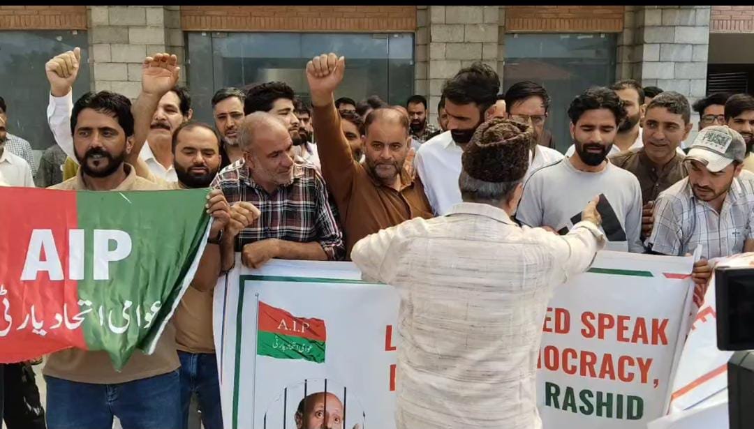 شرکا نے پلے کارڈز اور بینرز اٹھا رکھے تھے جن پر انجینئر رشید کی رہائی کا مطالبہ کرنے والے نعرے لکھے تھے۔ واضح ہو کہ دہشت گردوں کی فنڈنگ کے ایک کیس کے سلسلے میں انجینئر رشید کو گرفتار کیا گیا ہے اور وہ گزشتہ 7 برسوں سے سلاخوں کے پیچھے ہیں۔ اشتیاق قادری، نذیر احمد خان، شیخ خورشید اور فردوس بابا سمیت کئی پارٹی رہنما اس مظاہرے میں شامل ہوئے، جنہوں نے اس طرف توجہ مبذول کرائی جسے انہوں نے طویل اور بلاجواز نظربندی قرار دیا۔