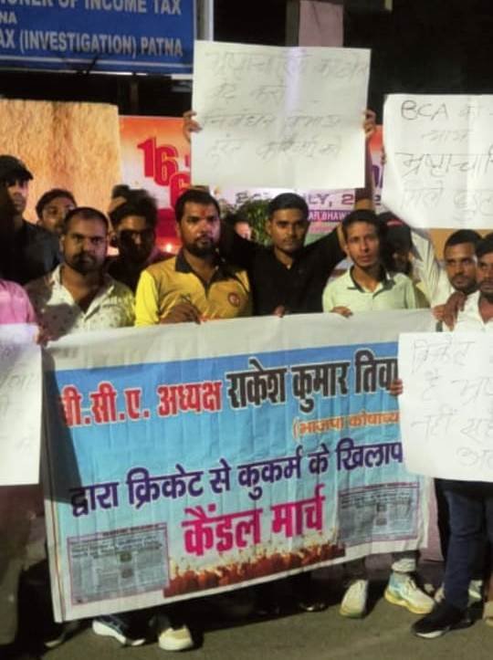 پٹنہ۔ بہار کرکٹ ایسوسی ایشن (بی سی اے) کے اندر بدعنوانی کی خبروں کی اشاعت کے بعد، کھلاڑیوں نے آج سابق کرکٹر اور اسٹوڈنٹ جنتا دل یونائیٹڈ بہار ریاست کے نائب صدر کرشنا پٹیل کی قیادت میں ملر ہائی اسکول گراؤنڈ سے پٹنہ میں انکم ٹیکس راؤنڈ اباؤٹ تک پرامن کینڈل لائٹ مارچ نکالا۔