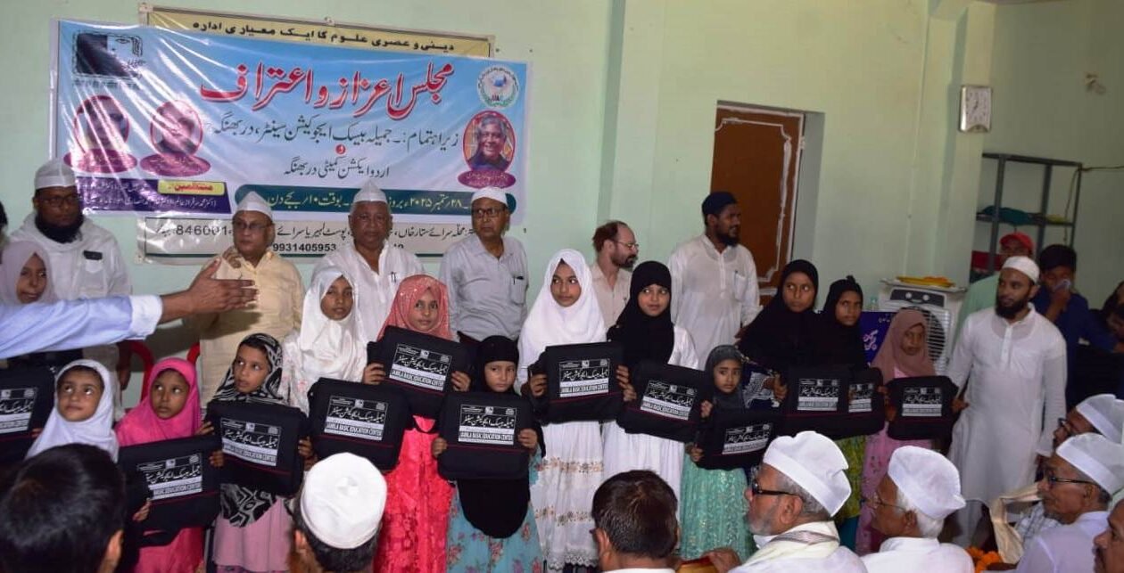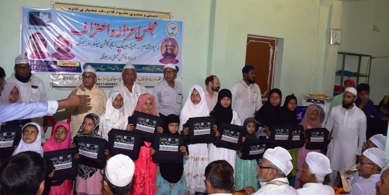 دربھنگہ(فضاامام): جمیلہ بیسک ایجوکیشن سینٹر کے وسیع و عریض ہال میں محلے ان تمام بزرگوں کو جو سرکاری ملازمت کے کسی بھی عہدے سے اپنی خدمات پوری کر کے سبک دوش ہو چکے ہیں ان کی خدمات کے اعتراف میں ایک مجلس اعتراف و اعزاز منعقد کر کے جمیلہ بیسک ایجوکیشن سینٹر کے منتظمین نے مومنٹو، شال، ٹوپی اور مالا پہنا کر ان کی عزت افزائی کی اور اعزاز سے نوازا جس کی صدارت ۰ پروفیسر دلیپ کمار چوہدری سابق پرنسپل سی ایم سائنس کالج دربھنگہ نے فرمائی مہمان خصوصی کےطور پر روزنامہ قومی تنظیم کے مدیر اعلی اور اردو ایکشن کمیٹی بہار کے صدر جناب ایس ایم اشرف فرید صاحب ، ڈاکٹر عبدالودود قاسمی صاحب اسسٹنٹ پروفیسر کے ایس کالج لہریا سرائے دربھنگہ اور حضرت مولانا قاری نسیم اختر صاحب قاسمی صدر مدرس مدرسہ اسلامیہ جھگروہ مسجد ،جناب غلام محمد انصاری پرنسپل بی ایڈ اورینٹل کالج دربھنگا اور ڈاکٹر سرفراز عالم صاحب کے اسسٹنٹ پروفیسر کے اس کالج گیاتشریف فرما تھے ، پروگرام کا باضابطہ آغاز سینٹر کے طالب علم یوسف اعجاز کے تلاوت کلام اللہ سے ہوا اس کے بعد عزیزم شہفوز نے نعت نبی پیش کیا اس کے بعد سینٹر کے طلبہ و طالبات نے نظم نعت اور تقریر وغیرہ پیش کی جس کے بعد محلے کے تمام تمام سرکاری ملازمت سے سبکدوش دوش بزرگوں کو اعزاز سے نوازا گیا جن کے نام یہ ہیں ماسٹر ظہیر الدین انصاری صاحب ریٹائر اسسٹنٹ ٹیچر مڈل اسکول ، جناب منہاج الحق صاحب ریٹائر مرواری کالج دربھنگہ، جناب ماسٹر شفیع الرحمن صاحب اسسٹنٹ ٹیچر حیا گھاٹ ،ماسٹر کلیم اللہ صاحب ریٹائر ہیڈ ماسٹر کمتول ،جناب شوکت علی صاحب ریٹائر کلرک ہنومان نگر بلاک ، جناب محفوظ انور اعجاز صاحب ریٹائر انڈین ایئر فورس ، جناب فخر عالم صاحب ، جناب مرتضی صاحب شفیع مسلم ہائی اسکول، اور جناب ممتاز صاحب ریٹائر انڈین ریلوے ، پروگرام سے خطاب کرتے ہوئے پروفیسر دلیپ کمار چو دھری کہ ریٹائر بزرگوں کہ خدمات کا اعتراف کرتے ہوئے ان کو اعزاز سے نماز نہ اور عزت افزائی کرنا اپنے آپ میں یہ ایک انوکھی پہل ہے ایسا کہیں دیکھنے کو نہیں ملا اس کے لیے جتنے بھی جمیلہ بیسک ایجوکیشن سینٹر کے ذمہ داران ہیں منتظمین ہیں قابل مبارکباد ہیں اور اپ کا یہ عمل قابل تعریف ہے ۔پروگرام سے خطاب کرنے والوں میں جناب ایس ایم اشرف فرید صاحب حضرت مولانا قاری نسیم اختر صاحب قاسمی،ڈاکٹر سرفراز عالم صاحب ڈاکٹر غلام محمد انصاری صاحب ماسٹر کلیم اللہ صاحب مولانا عابد حسین صاحب صدر مدرس جمیلہ بیسک ایجوکیشن سینٹر کے نام شامل ہیں محلے کے بزرگوں کو اعزاز سے سے نوازنے کے بعد جمیلہ بیسک ایجوکیشن سینٹر کے ششماہی امتحان میں حفظ و ناظرہ اور قواعد کے جن طلبہ و طالبات نے بہترین کارکردگی کا مظاہرہ کیا اور اول دوم سوم پوزیشن حاصل کیےان تمام کو انعام و اعجاز سے نوازا گیا اور حوصلہ افزائی کی گئی ساتھ ہی سینٹر کے تمام 130 طلبہ و طالبات کے درمیان سینٹر کی طرف سے بیگ کاپی قلم پنسل اور آلات علم تقسیم کیا گیا اس پروگرام میں بری تعداد میں درجنوں کالجوں کے پروفیسران ا اور محلے کے گارجین حضرات تشریف فرما رہے جن میں بطور خاص ڈاکٹر غلام محمد انصاری صاحب پرنسپل اورینٹل بی ایڈ کالج دربھنگا ڈاکٹر سرفراز عالم صاحب اسسٹنٹ پروفیسر گیا کالج گیا ڈاکٹر جمشید عالم صاحب صدر شعبہ پلوٹکنک ملت کالج دربھنگا ،جناب مشتاق اقبال صاحب ، ماسٹر امتیاز عالم صاحب، نوشابہ میم ،صدر مدرس مولانا عابد حسین صاحب، جناب محمد شرف الدین انصاری صاحب ،جناب افلاک منظر صاحب، مدرسین حافظ جسیم الدین اور قاری شمسان انجم صاحب، جناب تنویر صاحب ،جناب وصی صاحب ،جناب تنویر الحسن صاحب ،جناب محمد اصغر حسین صاحب ،جناب محمد معراج احمد صاحب وغیرہ موجود تھے۔