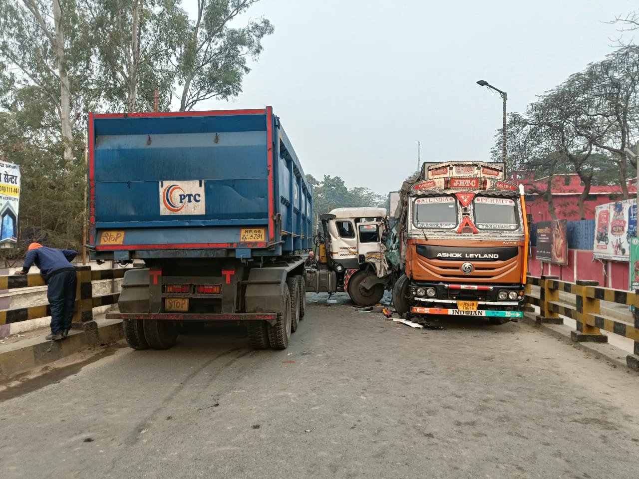 ट्रक यूपी के आगरा से रांची की ओर माल लेकर जा रहा था। कचहरी चौक की ओर से रेडमा ओवरब्रिज पर चढ़ते समय रेडमा चौक की तरफ से आ रहे तेज रफ्तार हाइवा अचानक मुड़ गया और सीधे उसके ट्रक में टक्कर मार दी। टक्कर इतनी जोरदार थी कि दोनों वाहन पुल पर ही फंस गए। हादसे के बाद हाइवा चालक मौके से फरार हो गया। अगर वाहन टक्कर के बाद रेलिंग तोड़कर नीचे गिर जाते तो रेलवे ट्रेक भी बाधित हो जाता। नीचे से रेलवे लाइन गुजरी है।