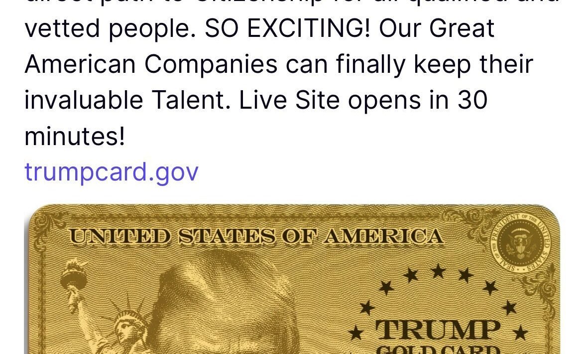 ट्रंप ने वॉइट हाउस के रूजवेल्ट रूम में बिजनेस लीडर्स की मौजूदगी में इस बहुप्रतीक्षित योजना की घोषणा की। उन्होंने ट्रुथ सोशल पर लिखा, ‘अमेरिकी सरकार का ट्रंप गोल्ड कार्ड आज आ गया। सभी योग्य और वेरिफाइड लोगों के लिए नागरिकता का सीधा रास्ता।अमेरिकी कंपनियां अपनी प्रतिभाओं को अपने पास रख पाएंगी। लाइव साइट 30 मिनट में खुलेगी।’