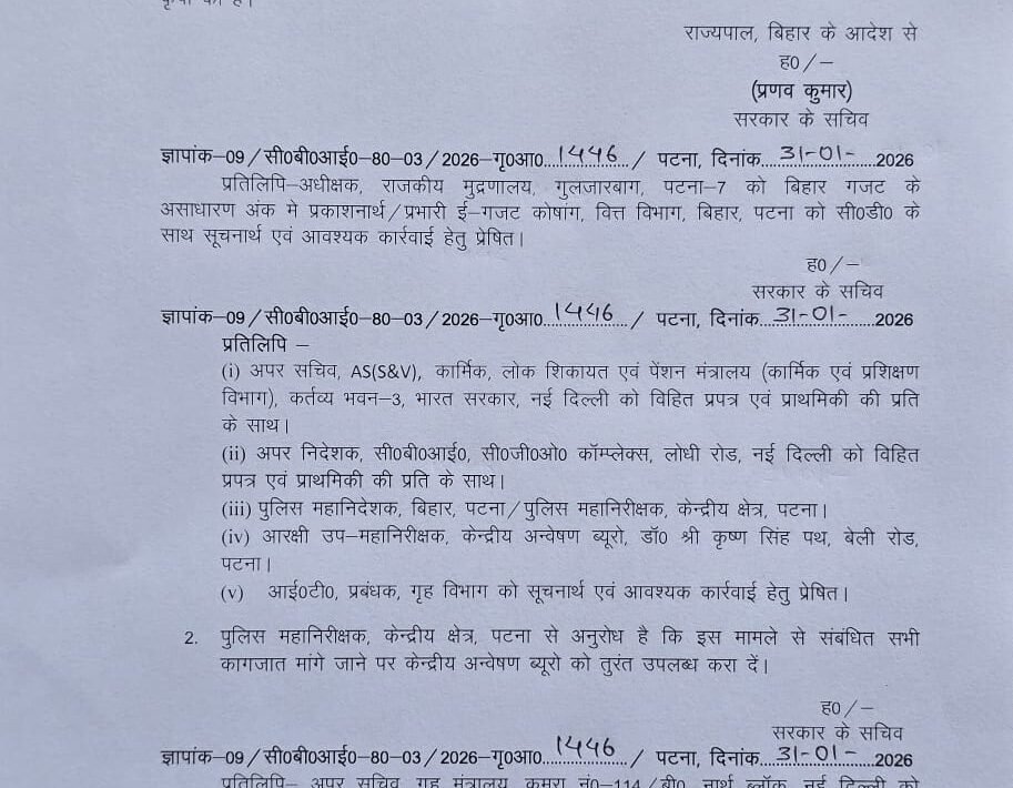 सरकारी आदेश के अनुसार, यह अनुमति दिल्ली विशेष पुलिस स्थापना अधिनियम, 1946 की धारा 6 के तहत दी गई है। अधिसूचना में उल्लेख है कि बिहार के राज्यपाल ने सीबीआई को जांच, पर्यवेक्षण और आवश्यक कार्रवाई के लिए राज्य में अधिकार क्षेत्र प्रदान किया है।
