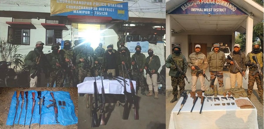 इंफाल पश्चिम जिले के पटसोई थानांतर्गत अंदरुनी इलाके के संगैथेल माखा लेइकाई इलाके से शुक्रवार को एक मॉडिफाइड .303 राइफल बिना मैगजीन के, दो लोकल मेड बोल्ट एक्शन सिंगल बैरल गन, चार पिस्तौल और हर एक में एक मैगजीन, दो नंबर 36 एचई ग्रेनेड बिना डेटोनेटर के, एक एचई बम, 15 राउंड .303 कारतूस और तीन चार्जर क्लिप, आठ .303 ब्लैंक कार्ट्रिज, एक एसएलआर ब्लैंक कार्ट्रिज, एक बीपी वेस्ट और दो लोहे की प्लेट, दो कैमोफ्लाज हेलमेट और तीन बैग बरामद किया गया है।