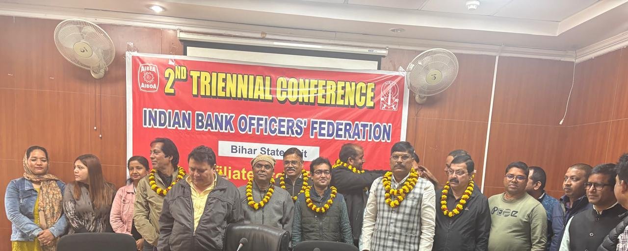 Indian Bank Officers’ Federation (IBOF), बिहार राज्य इकाई का राज्य स्तरीय कॉन्फ्रेंस आज पटना स्थित बिहार टेक्स्ट बुक कॉर्पोरेशन कैंपस के कॉन्फ्रेंस हॉल में IBOF के संविधान एवं By-laws के अनुरूप शांतिपूर्ण एवं लोकतांत्रिक वातावरण में सफलतापूर्वक संपन्न हुआ। कॉन्फ्रेंस में बिहार के विभिन्न ज़ोनों से बड़ी संख्या में बैंक अधिकारियों एवं सदस्यों ने भाग लिया।