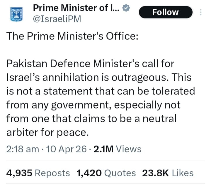 इजराइल के प्रधानमंत्री बेंजामिन नेतन्याहू कार्यालय ने एक्स पोस्ट कर पाकिस्तानी रक्षामंत्री के बयान की निंदा करते हुए कहा कि इसराइल के खात्मे की कामना बेहद आपत्तिजनक है। खासकर उस सरकार से जो खुद को शांति का मध्यस्थ बताती हो, उससे ऐसे बयान की उम्मीद नहीं की जा सकती।