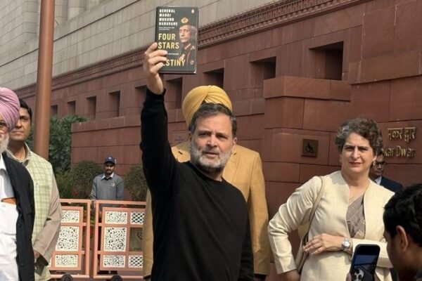 راہل گاندھی نے پارلیمنٹ کے احاطے میں نرو نے کی غیر مطبوعہ کتاب دکھلاتے ہوئے حکومت پر نشانہ سادھا