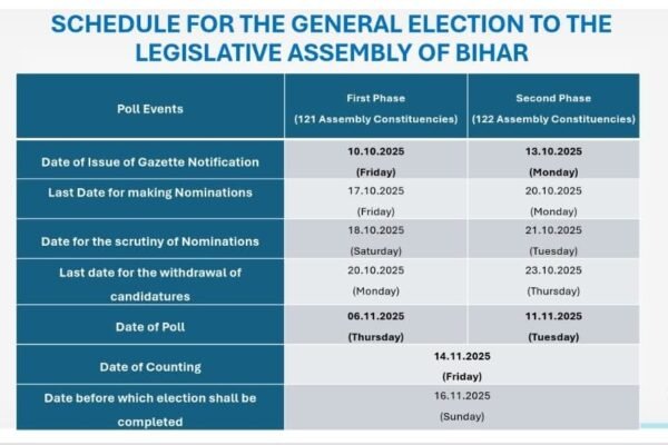 बिहार, हिंदी बिहार विधानसभा चुनाव 2025: दूसरे चरण की अधिसूचना आज से जारी, 122 सीटों पर होगा मतदान Posted onOctober 13, 2025October 13, 2025 पटना, 13 अक्टूबर बिहार विधानसभा चुनाव 2025 के दूसरे चरण के लिए नामांकन की प्रक्रिया आज से औपचारिक रूप से शुरू हो जाएगी। इस चरण …