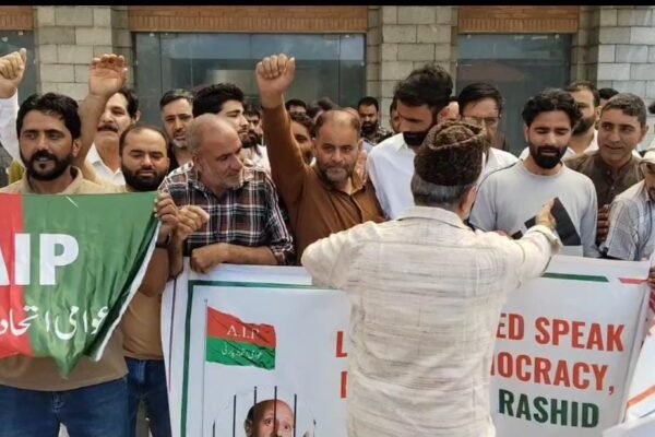 ممبر پارلیمنٹ شمالی کشمیر انجینئر رشید کی رہائی کے لیے سری نگر میں اے آئی پی کا احتجاجی مظاہرہ