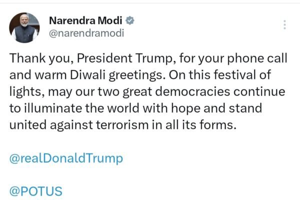 राष्ट्रीय, हिंदी प्रधानमंत्री मोदी ने ट्रंप का दीपावली पर फोन करने और शुभकामना देने के लिए आभार जताया Posted onOctober 22, 2025October 22, 2025 नई दिल्ली, 22 अक्टूबर प्रधानमंत्री नरेन्द्र मोदी ने अमेरिकी राष्ट्रपति डोनाल्ड ट्रंप के दीपावली पर भेजे गए बधाई संदेश के लिए उनका आभार जताया है। …