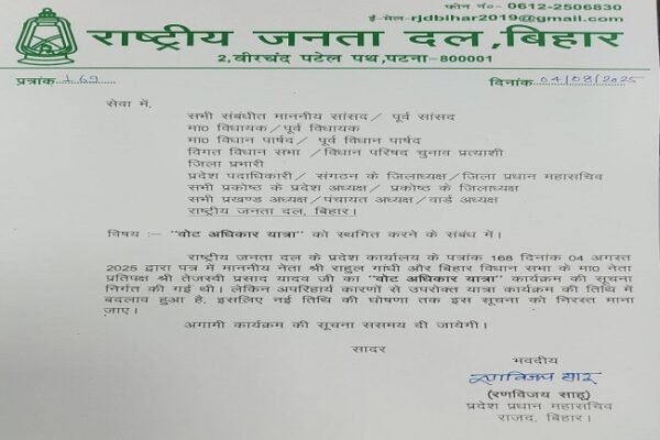 बिहार, हिंदी राहुल गांधी और तेजस्वी यादव की 10 अगस्त से बिहार में शुरू हाेने वाली मतदाता अधिकार यात्रा स्थगित Posted onAugust 5, 2025August 5, 2025 पटना, 5 अगस्त बिहार में 10 अगस्त से राहुल गांधी और तेजस्वी यादव की शुरू हाेने वाली मतदाता अधिकार यात्रा स्थगित कर दी गयी है। …